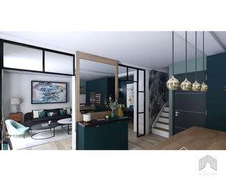 La proposition n°1 pour cette cuisine est d'inspiration Art Déco, avec un meuble d'entrée & séparation style verrière.